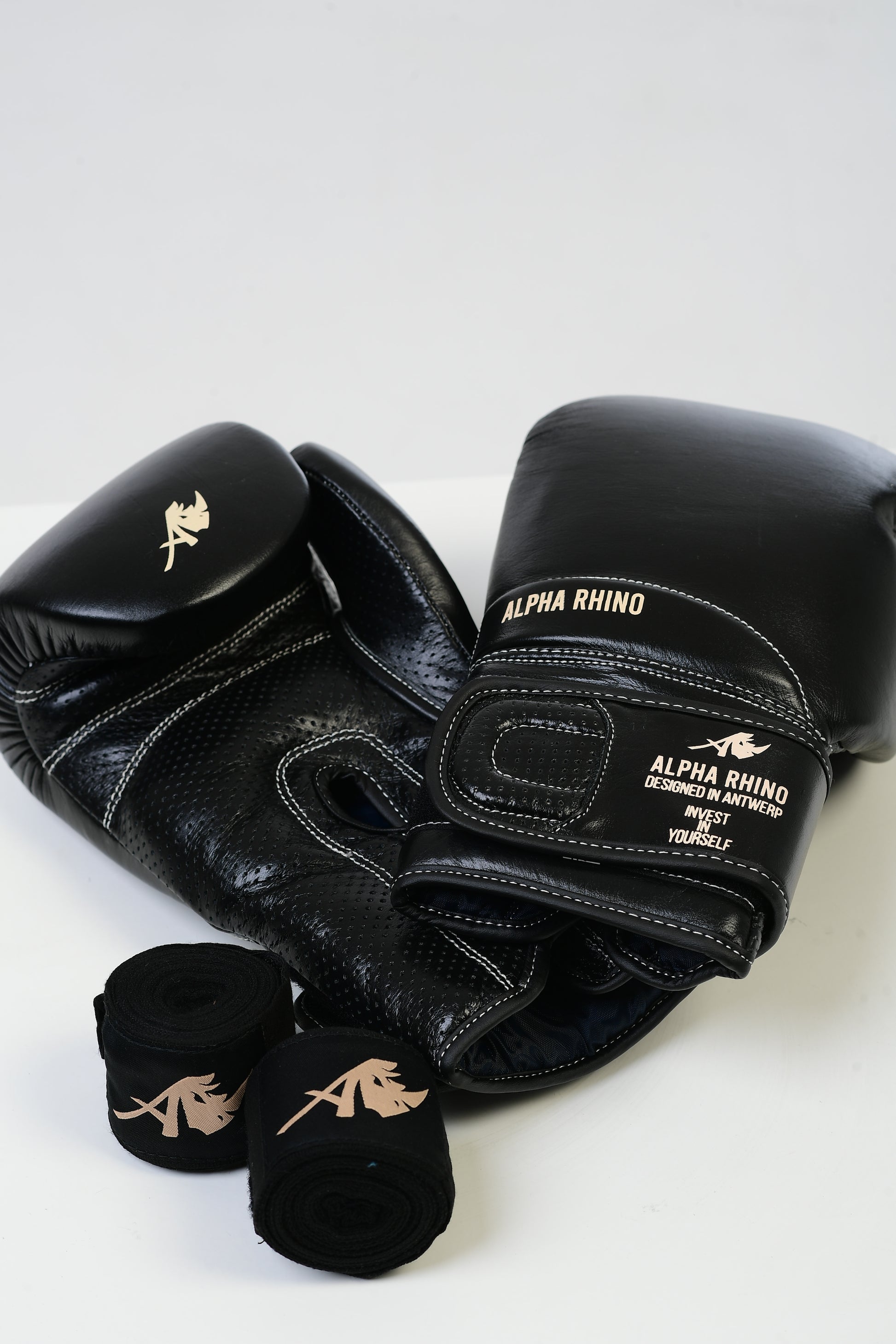 Train like a pro with Alpha Rhino Black Boxing Gloves. Crafted from premium cowhide leather, these gloves combine durability, comfort, and style, with a bold beige signature detail.