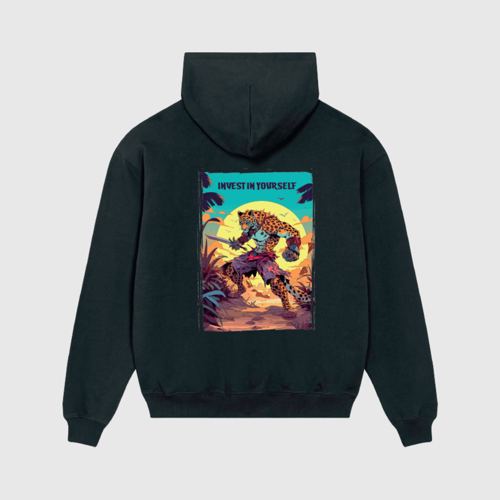 Make a statement with the Alpha Rhino Oversized Black Hoodie with Leopard Print. Crafted from French Terry, 100% organic carded cotton (400 g/m²), this heavyweight hoodie combines comfort, durability, and bold streetwear style. The oversized fit ensures freedom of movement, while the leopard graphic on the back adds a fierce and stylish design element.