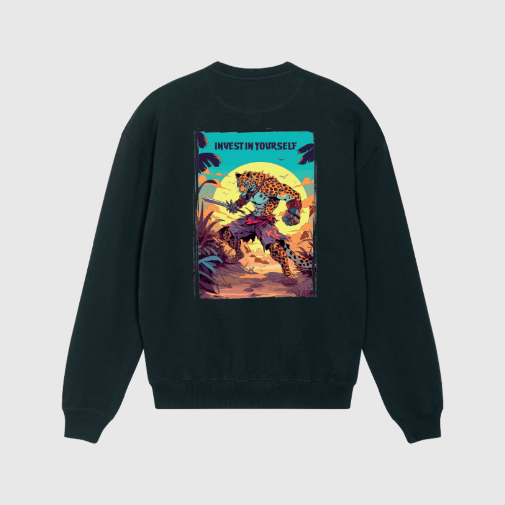 Stand out with the Alpha Rhino Oversized Black Sweater with Leopard Print. Crafted from French Terry, 100% organic carded cotton (400 g/m²), this heavyweight sweater combines comfort, durability, and bold streetwear style. The oversized fit ensures freedom of movement, while the leopard graphic on the back adds a fierce and stylish design element.